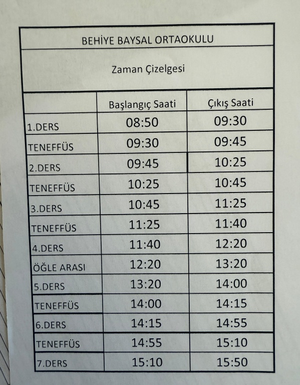 2025-2026 Eğitim-Öğretim Yılı Behiye Baysal Ortaokulu Ders Giriş-Çıkış Saatleri.